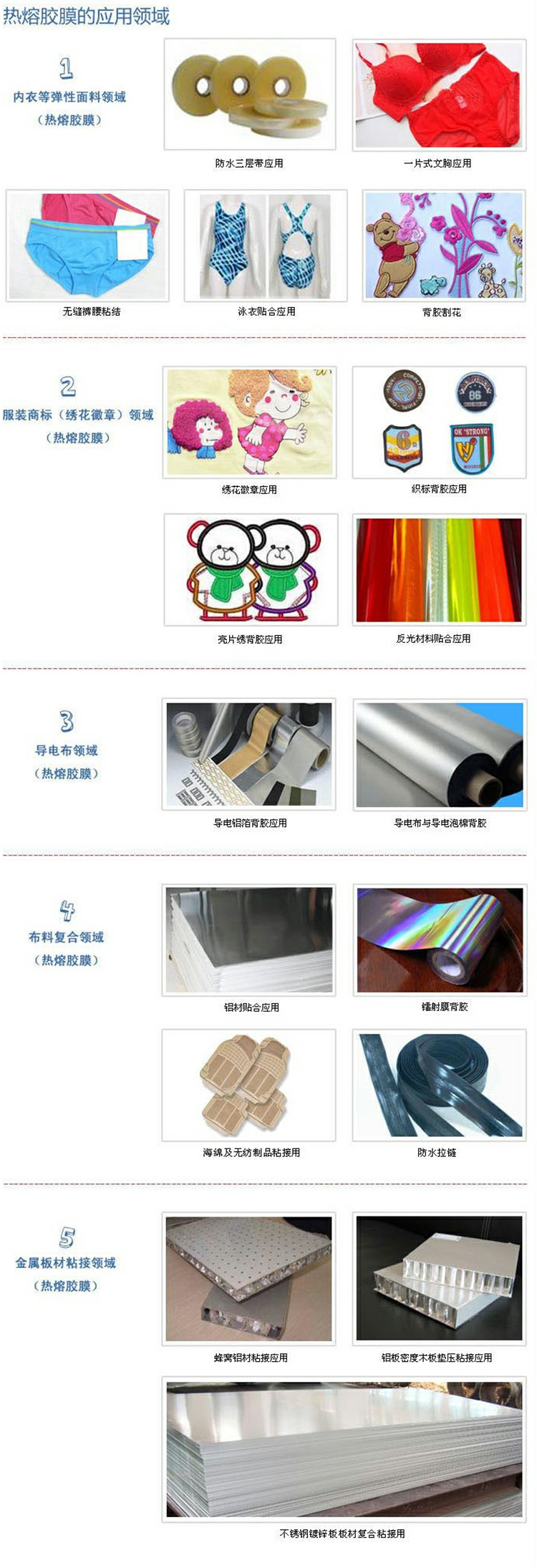 2、紡織、服裝面料、皮料復(fù)合用熱熔膠膜、熱熔膠網(wǎng)膜、彈力;