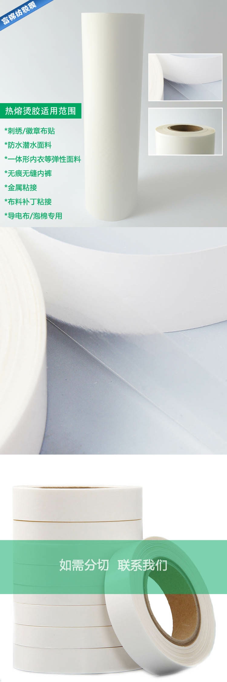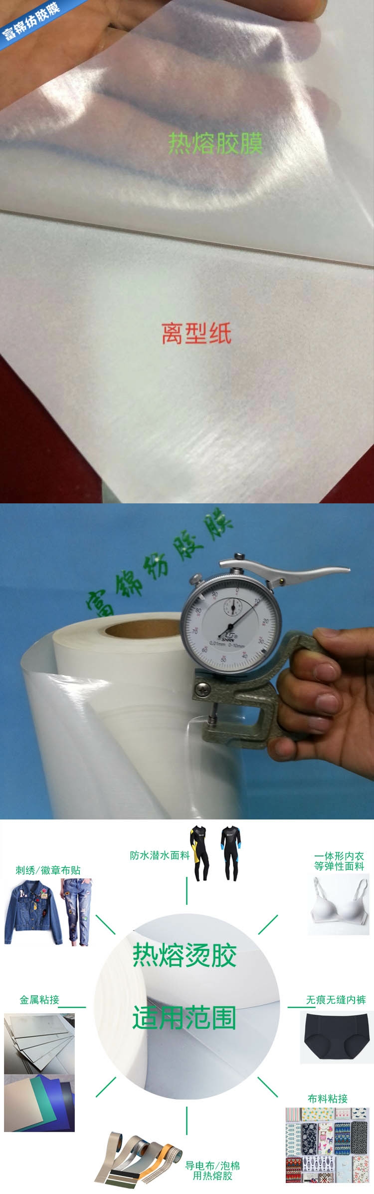 2、紡織、服裝面料、皮料復(fù)合用熱熔膠膜、熱熔膠網(wǎng)膜、彈力;