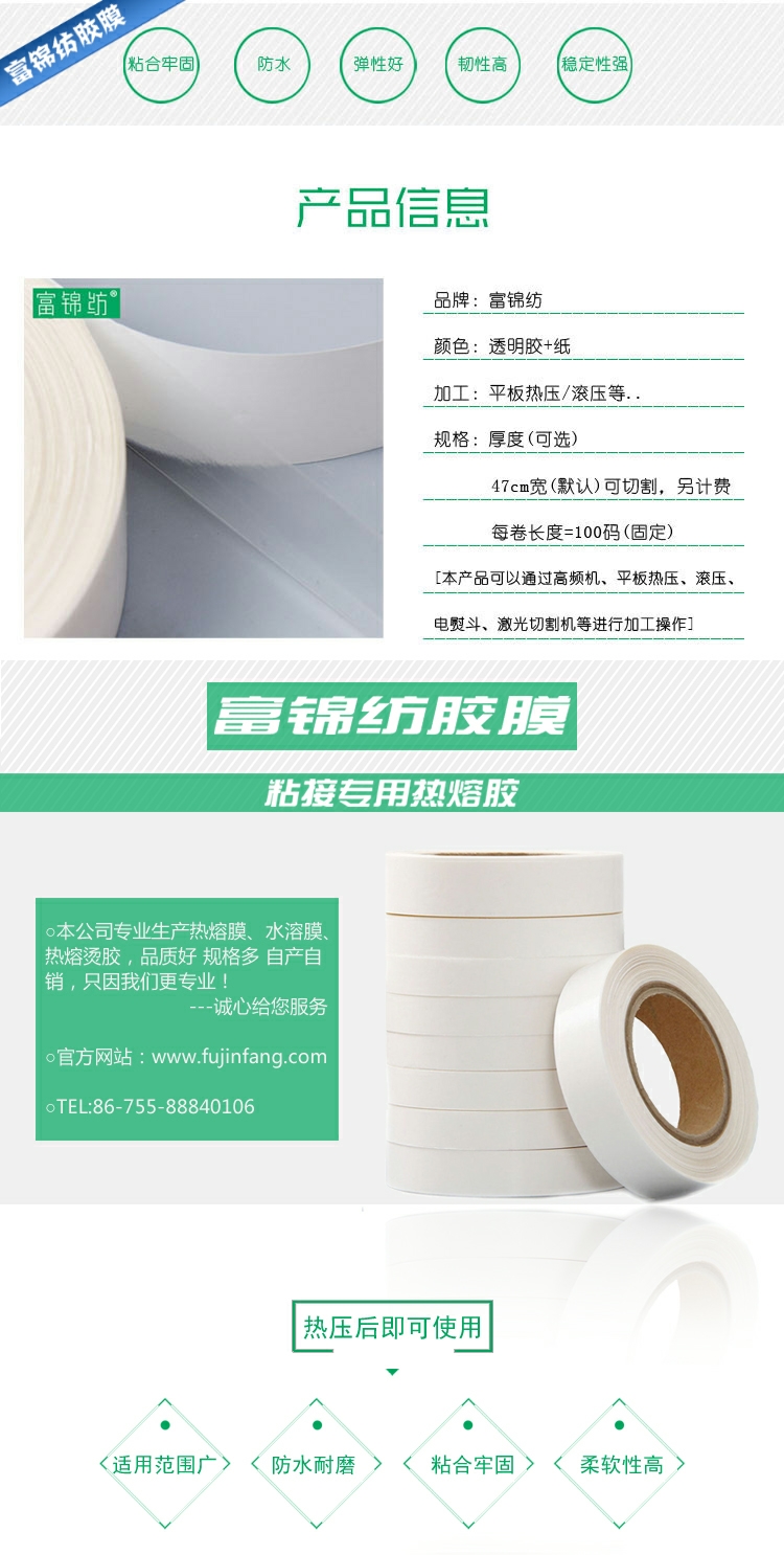 高分子環(huán)保熱熔膠膜具有兩面均能接著之特性,并接著力相當(dāng)強(qiáng)、耐候性強(qiáng)、耐水洗、干洗、耐酸、耐堿、抗張力、融點(diǎn)適中、操作方便等優(yōu)點(diǎn)。